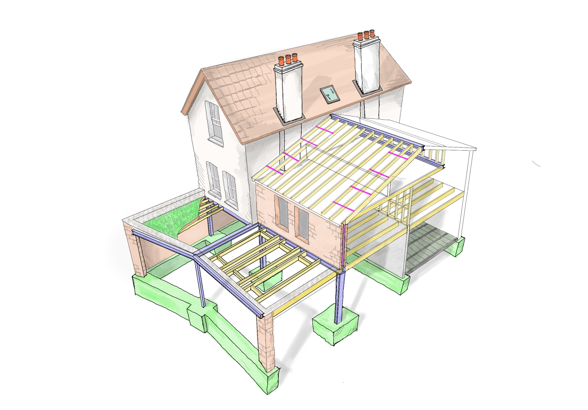 The angled wall layout presented a structural challenge, addressed through the use of lightweight steels to support the brickwork. These steels were strategically positioned onto a central post, discreetly concealed within the brick pier, maintaining a clean and modern aesthetic. Furthermore, the roof joists were specially designed to support a Green roof, contributing to energy efficiency and promoting biodiversity.