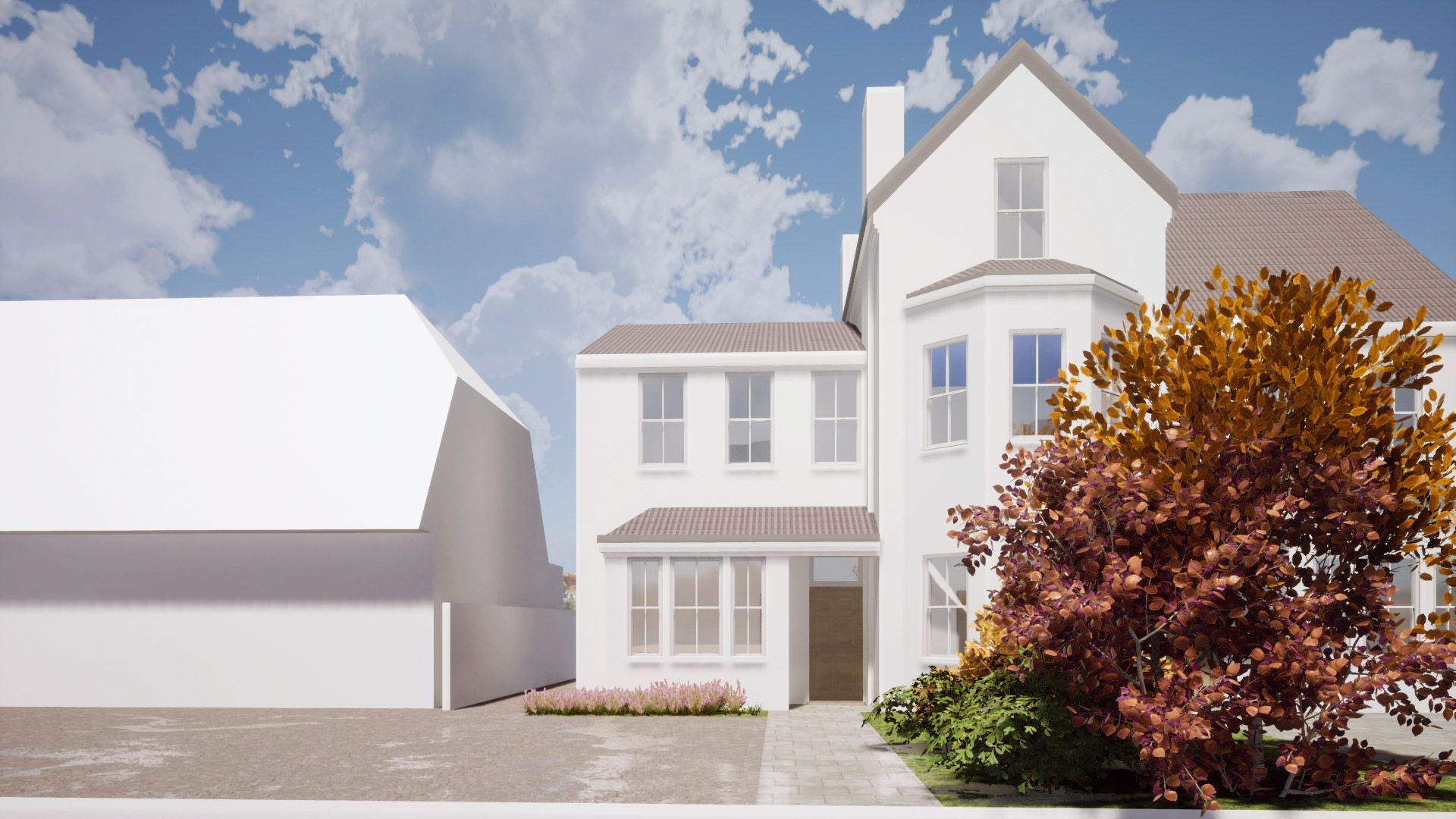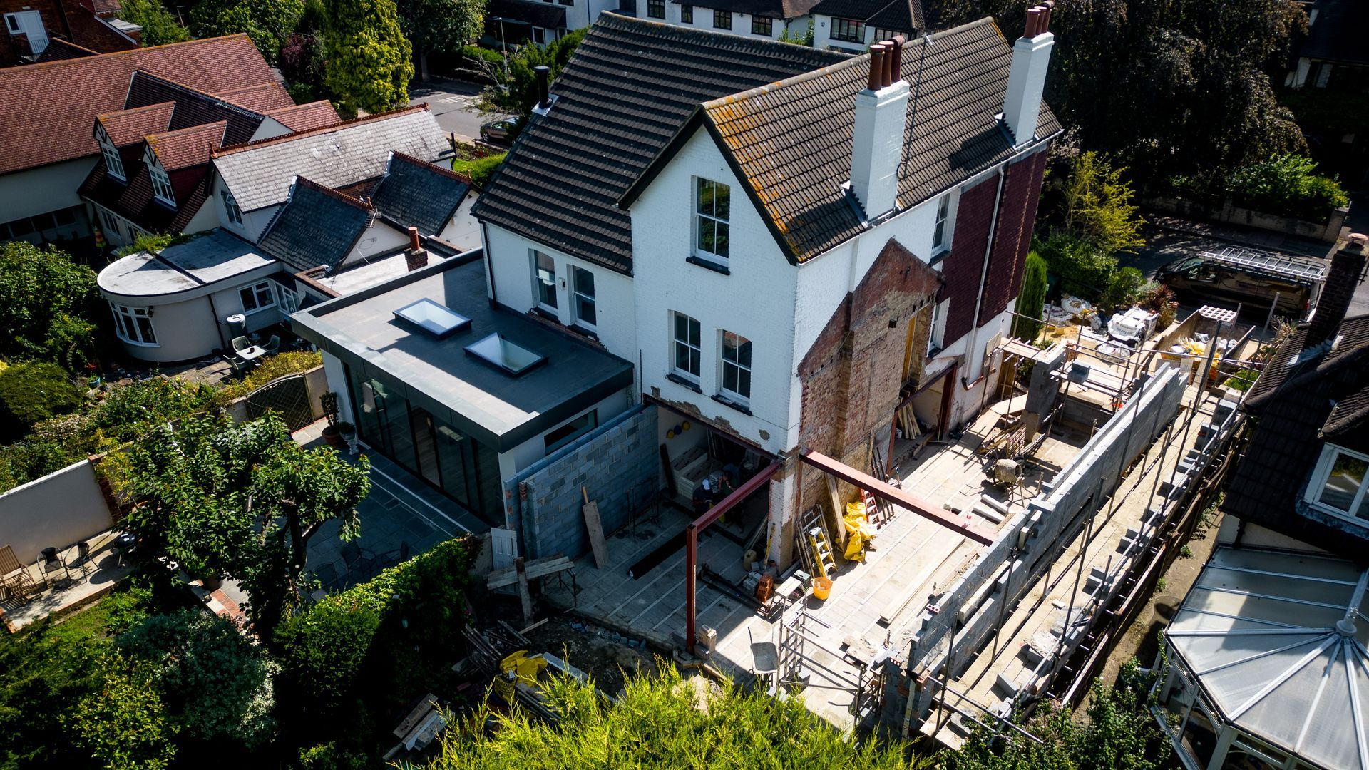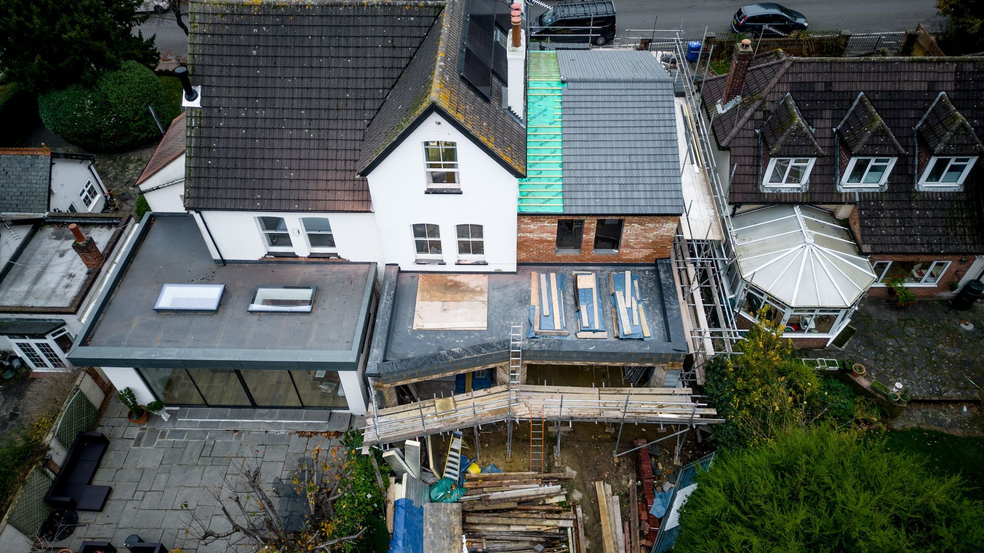 The renovation of this two-storey existing residential property involved the demolition of the existing side extension, making way for a new double-storey extension with a pitched roof designed to accommodate roof storage. Additionally, a rear large single-storey extension was added, featuring a distinctive angled modern wall layout.