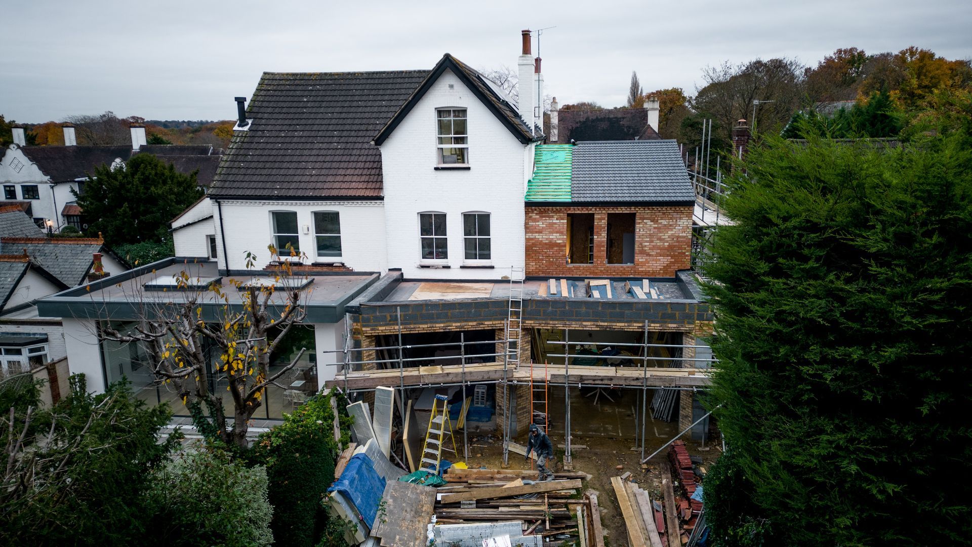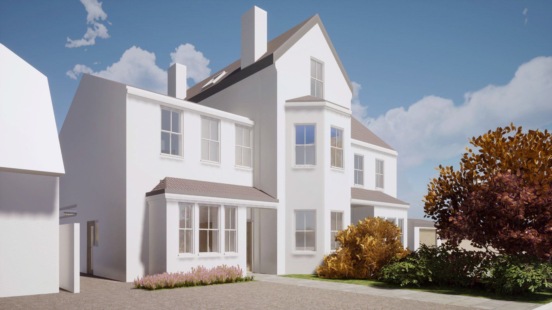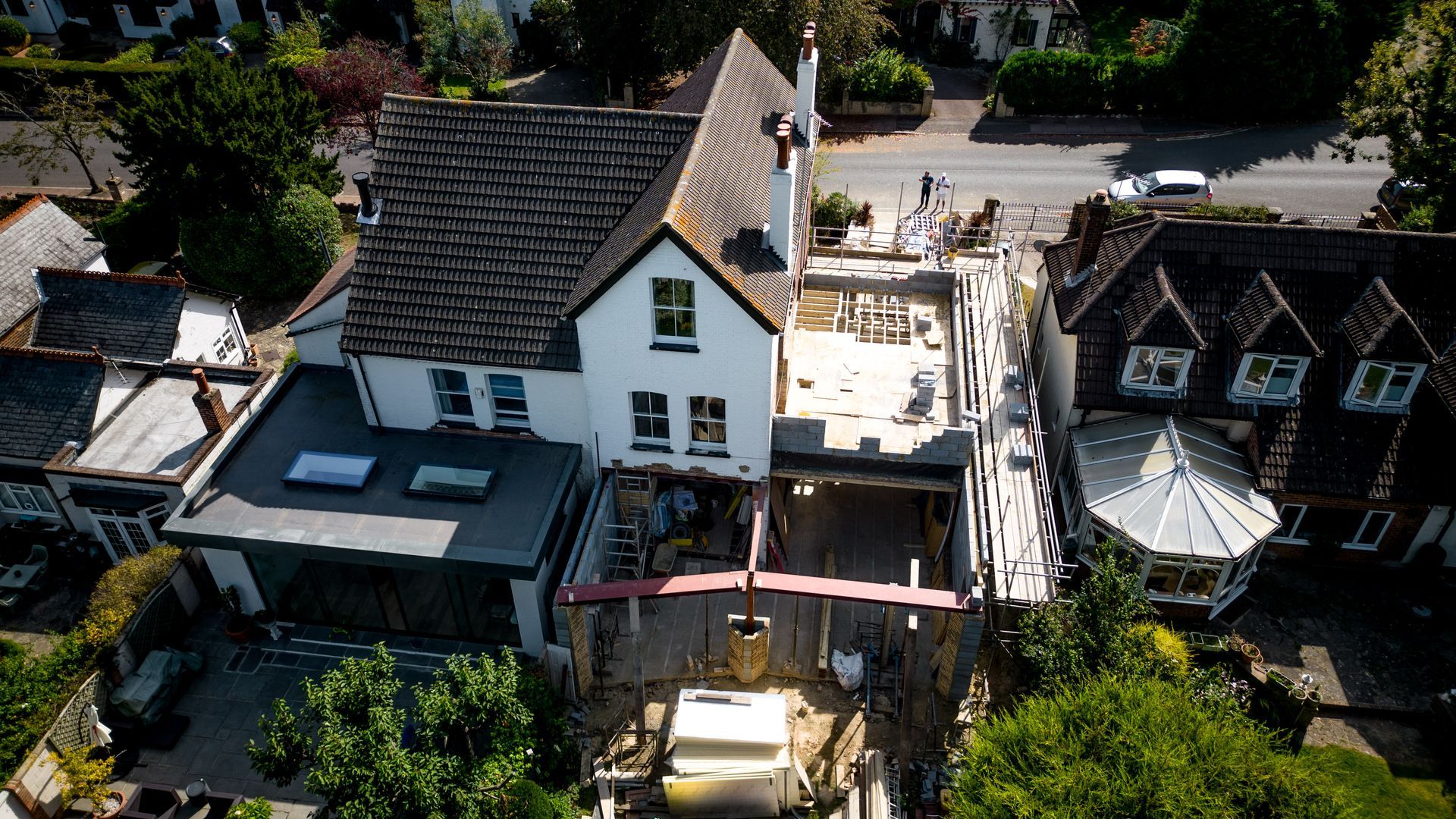 The renovation of this two-storey existing residential property involved the demolition of the existing side extension, making way for a new double-storey extension with a pitched roof designed to accommodate roof storage. Additionally, a rear large single-storey extension was added, featuring a distinctive angled modern wall layout.