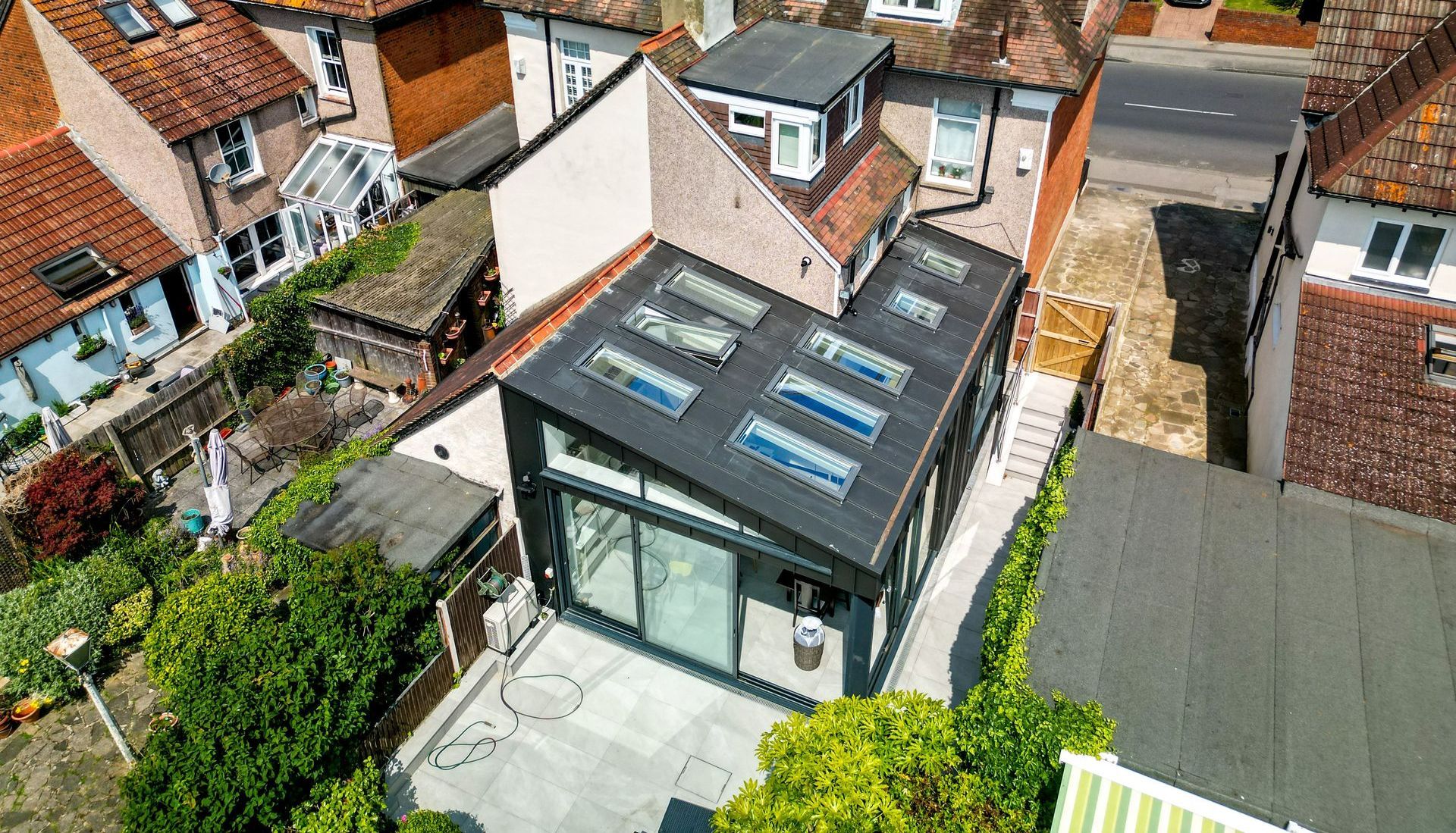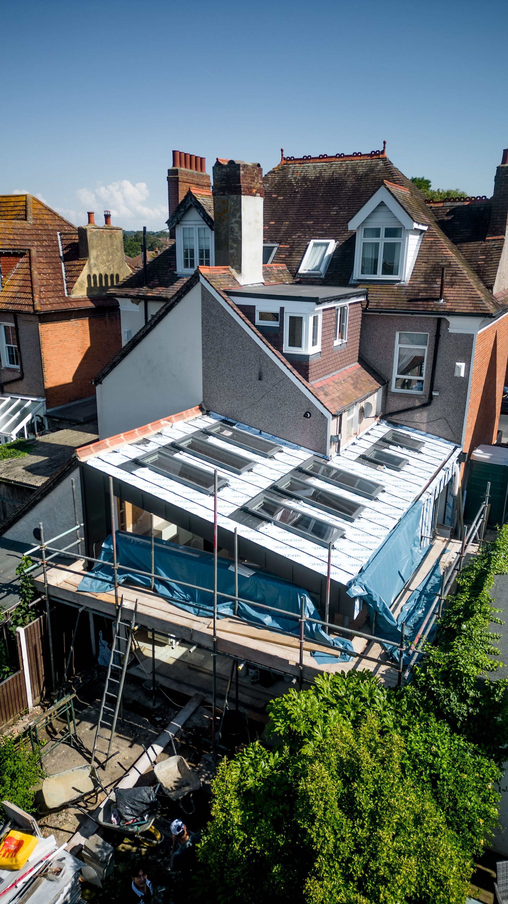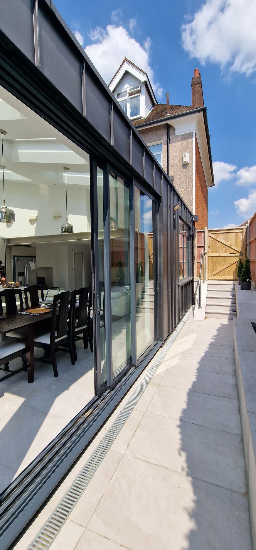 Additionally, the main rear frame of the extension was formed using steelwork, primarily due to the presence of large glazing openings and a limited presence of masonry walls. This strategic use of steel elements ensured both the structural stability and the aesthetic aspirations of the project, creating a seamless and well-supported transition between the existing and new spaces.
